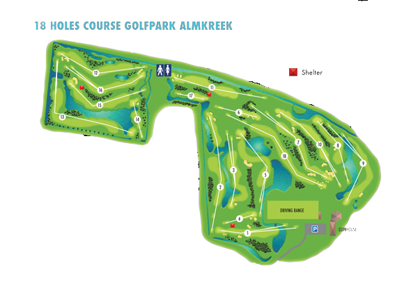 Golfpark Almkreek is een rustige jonge baan. De baan, met mooie hoogteverschillen tot 5 meter, is aangelegd in een polderlandschap. Deze biedt de speler een typisch Hollands vergezicht met koeien en weilanden. Door de aanleg van een eendenkooi, paddenpoel, moeras, kreken en bosschages hebben een zwanenkoppel, hazen en vele soorten zangvogels zich op de baan gevestigd. De schitterende waterpartijen maken de kwalitatief goed onderhouden baan een uitdaging voor zowel lage handicappers als minder geoefende spelers.Golfpark Almkreek biedt de mogelijkheid voor onervaren spelers, individueel of in groepsverband, onder deskundige toezicht van de golfprofessional, kennis te maken met de golfsport. Er is een uitdagende 9 par-3 baan, waarop zonder vaardigheidsbewijs gespeeld kan worden. |